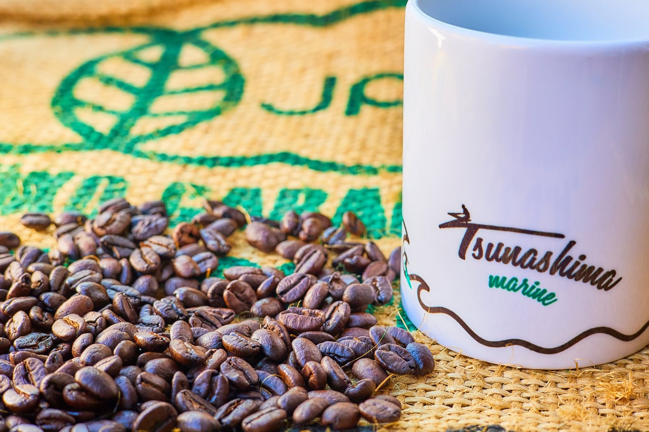 〜Yokohama Thunashima〜のロゴと海をイメージしたイラスト入りのオリジナルマグカップと、同じく横浜綱島にある焙煎珈琲豆屋「ぐらあんあみ」のコーヒー豆のセット